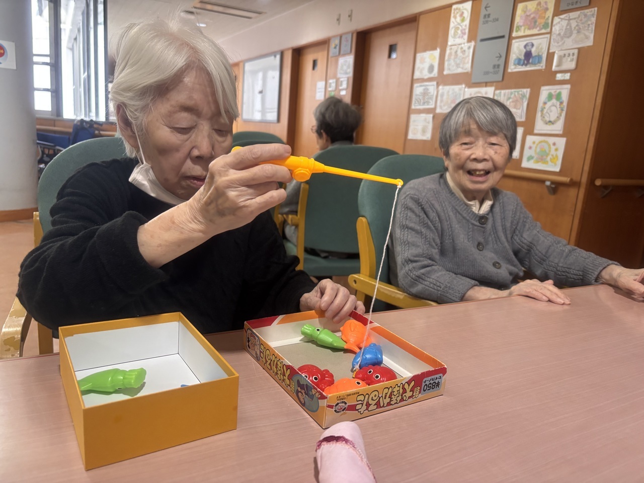 初めは。。。「こんなん簡単ですやん」とおっしゃっていましたが、いざやってみると「あれ?あれ?難しいな」「いやぁ~釣れへんやん」と隣の方とワイワイ、大笑いしながらしてくださっていました。