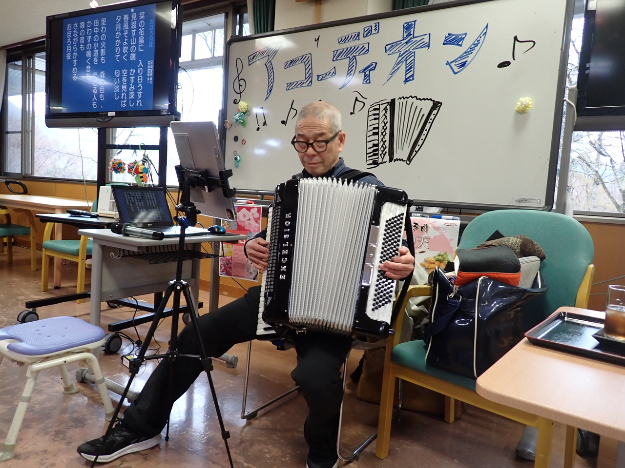 3月25日(水曜日)、本日は音楽ボランティアとしてアコーディオン奏者の方にお越しいただきました!